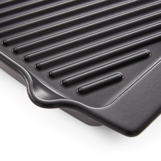 Weber grillpande er fremstillet i keramisk materiale, hvilket gør panden ridsefast og robust overfor maskinopvask. Pandens høje design gør det nemt at holde saften i pladen således at du er sikret en god sauce. Du kan anvende grillpanden til både gas, kul samt elgrill, og kan roligt smide den i opvaskemaskinen efter brug.